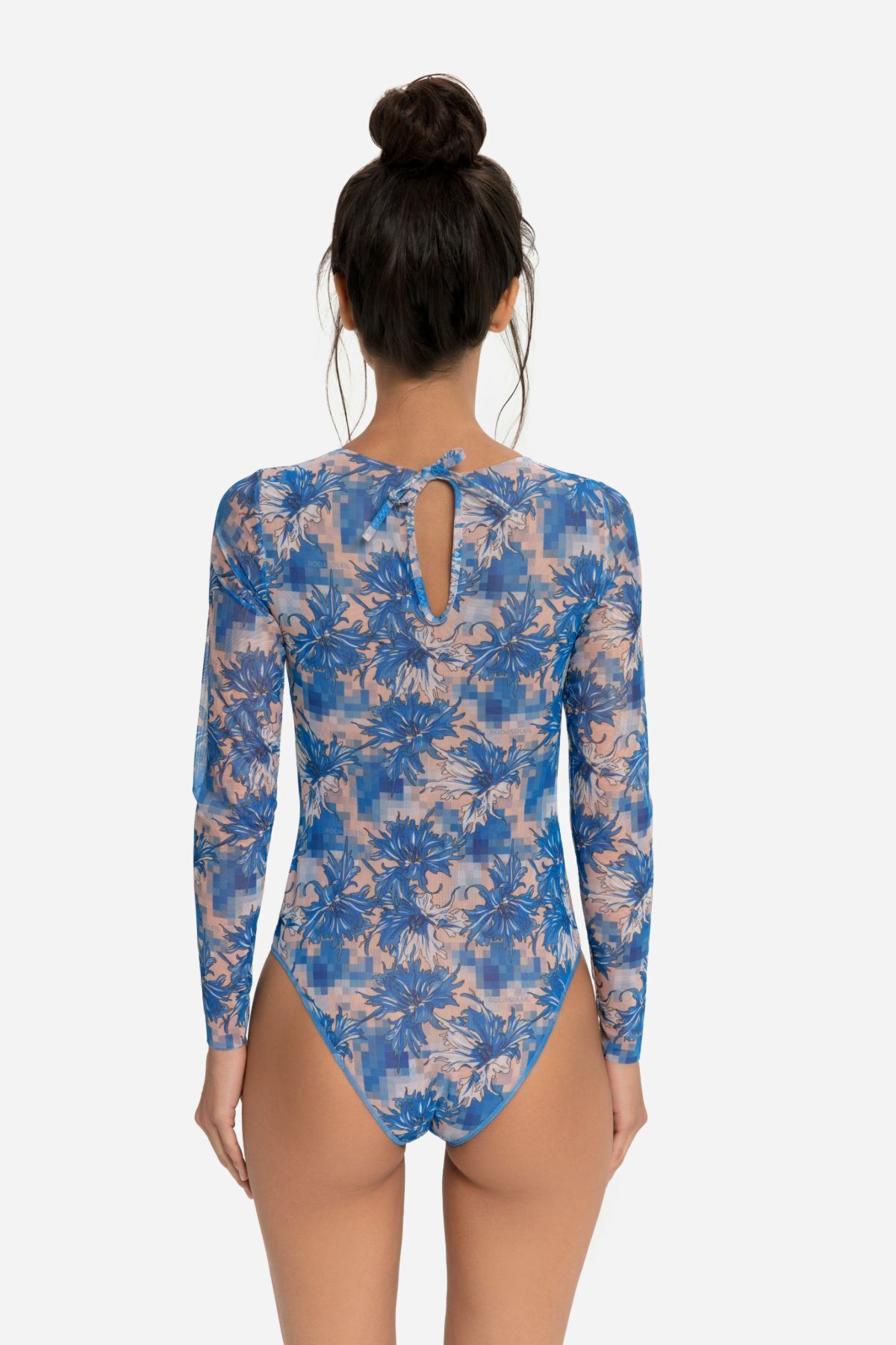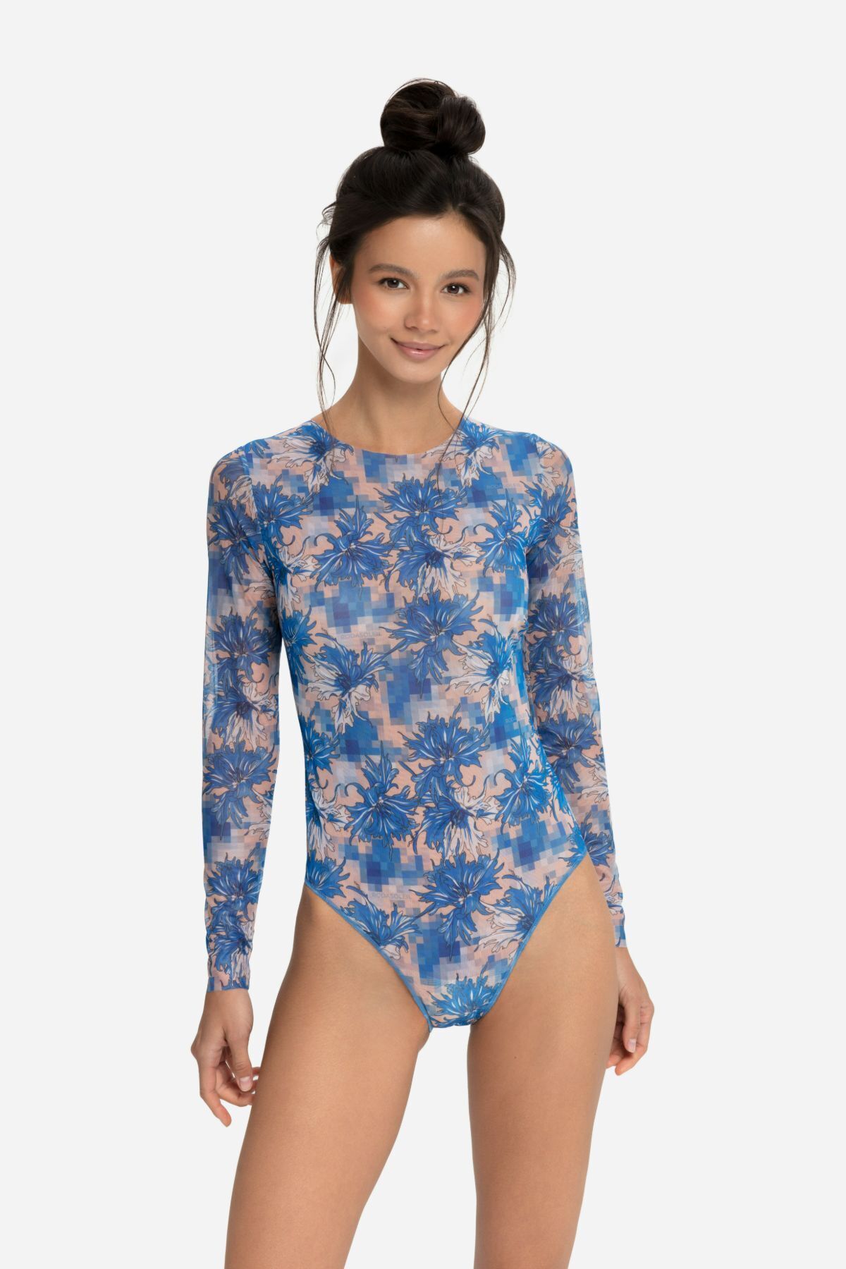 Сплошной купальник с рукавом "Васильки пиксели" (чашки)